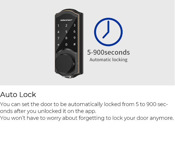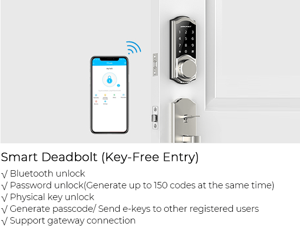Smart Features -With this SMONET SMUS-AM smart Bluetooth door lock, you can generate timed, permanent, one-time, and customized passcodes, which can be shared with your guests, friends, housekeepers, or employees. With its automatic locking function, you don’t need to worry about forgetting to lock the door anymore. Connect this door lock with your smartphone through Wi-Fi. All you need is a gateway, which is sold separately.